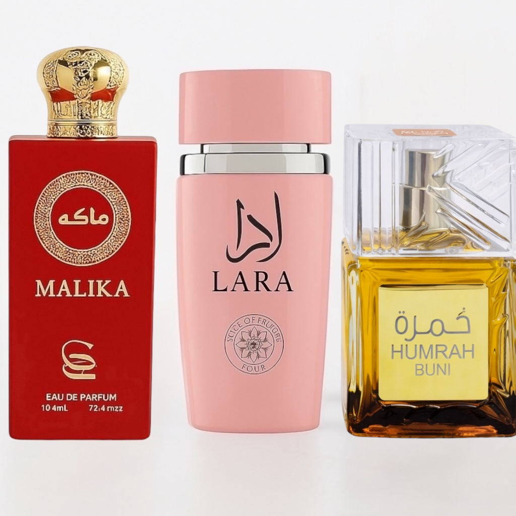 🌸 SET 3 PARFUMURI ARĂBEȘTI DAMĂ – LARA • HUMRAH BUNI • MALIKA (100 ml fiecare)